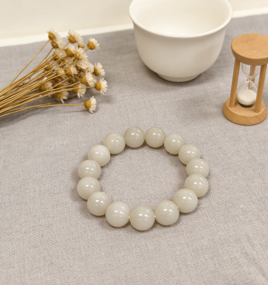 White Jade Bracelet 12mm, Natural Nephrite 43.6g, Classic Unisex Gift, Everyday Zen Jewelry