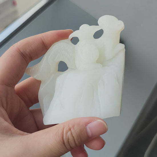 This remarkable sculpture is masterfully carved from a single, substantial block of creamy white nephrite jade. It depicts a spirited “Four-Tailed Mouse” proudly carrying a large ingot on its back. The intricate carving showcases fine details, from the mouse‘s alert expression and textured fur to the flowing arcs of its four tails and the smooth curves of the ingot. The solid, natural stone base provides grounding stability to this dynamic composition.