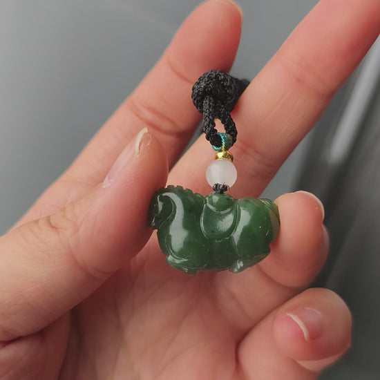 This charming pendant, known as the “Money Horse,” is lovingly carved from a single piece of rich green jasper. The horse is depicted in a gentle, resting pose with a smooth, rounded body and a calm demeanor. A classic Chinese coin is cleverly carved upon its back, visually capturing the playful and auspicious phrase “wealth immediately arrives.” The deep, even color and waxy polish of the jade make it a joy to touch and behold.