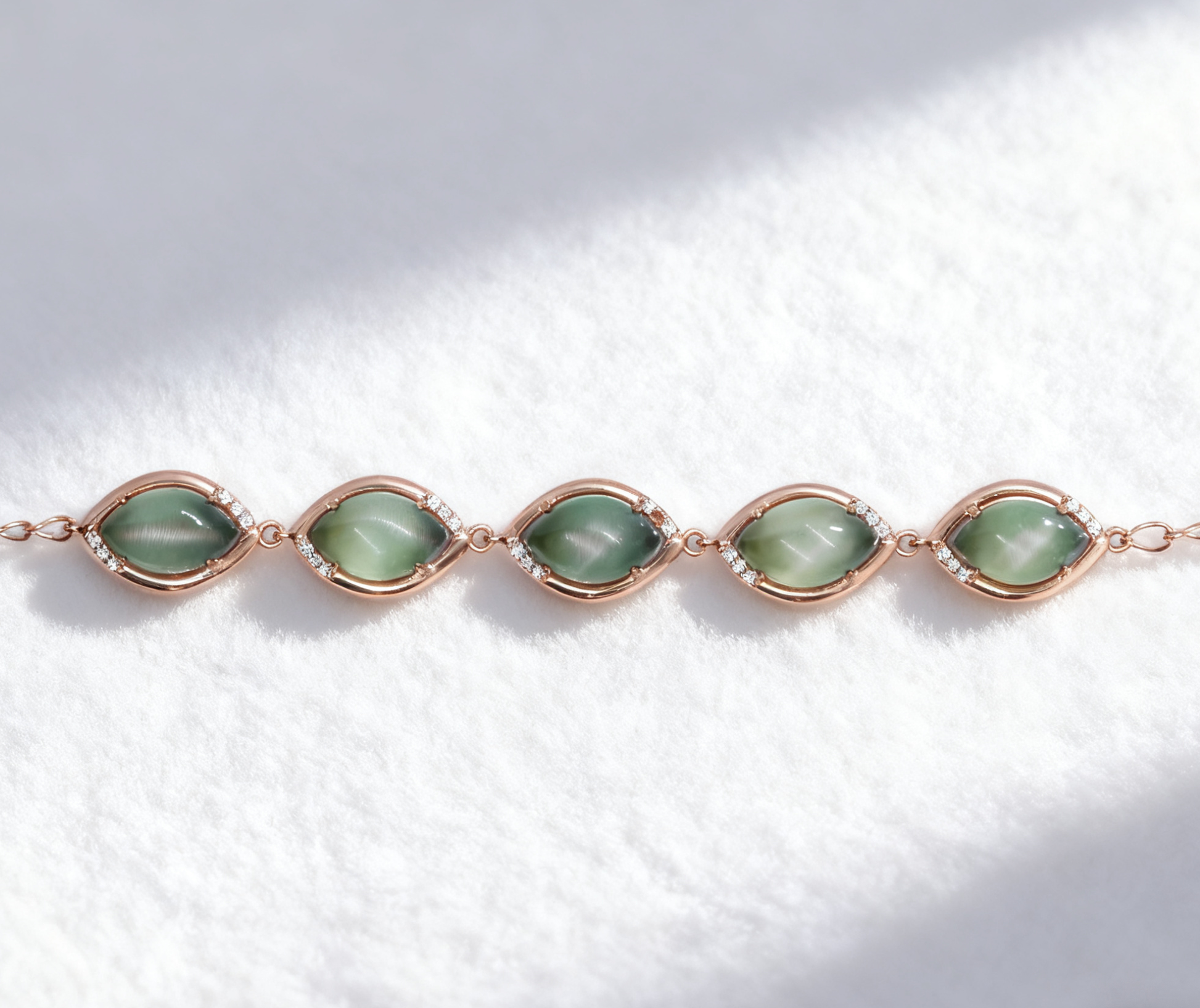 This exquisite bracelet features five evenly set, oval-shaped cat's eye nephrite cabochons. Each cabochon displays a rich spinach-green hue with a fine, oily luster. The most captivating feature is the distinct and lively cat's eye effect—a bright, shimmering band of light that glides across the stones with every movement of your wrist, showcasing its unique charm.