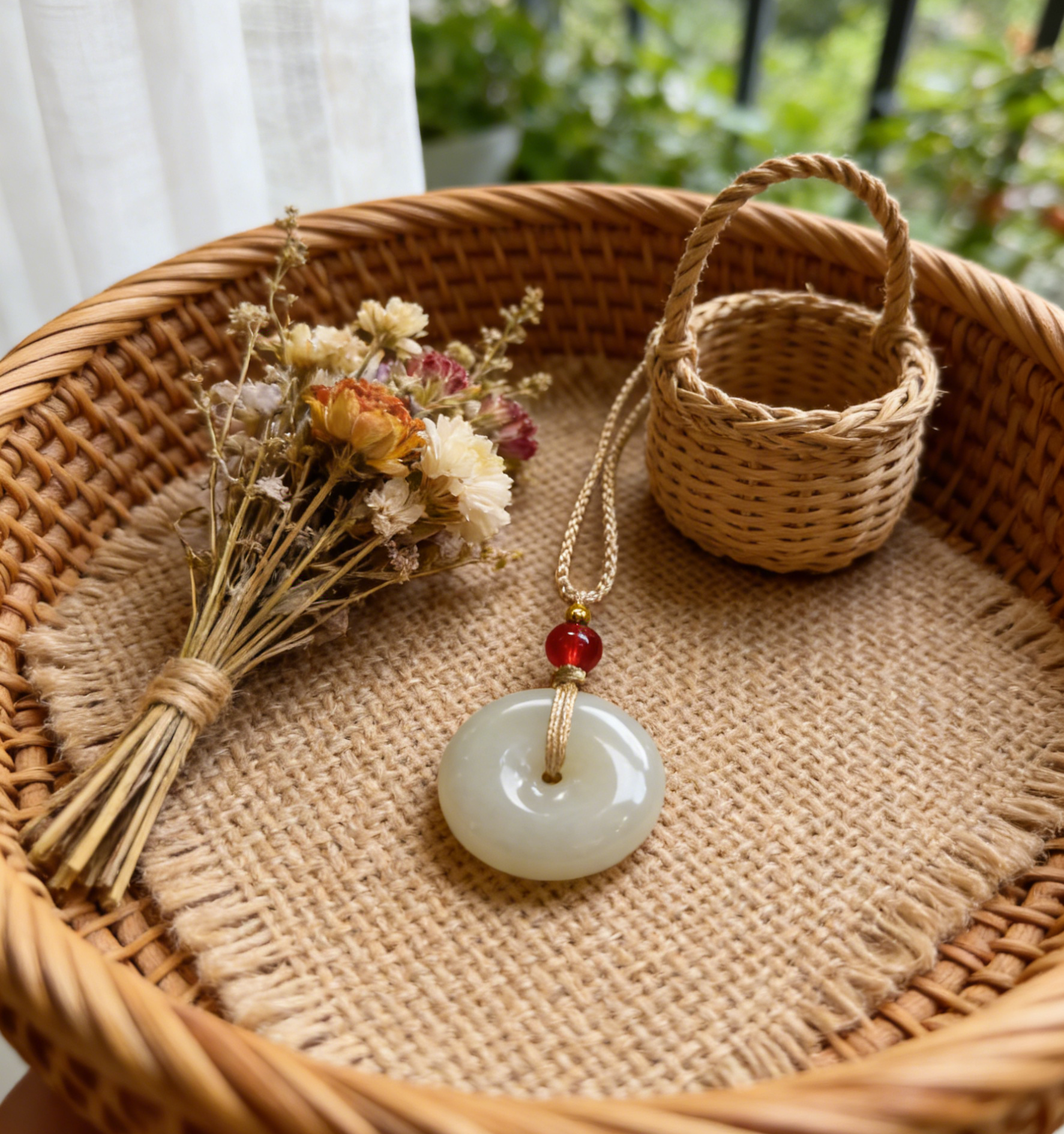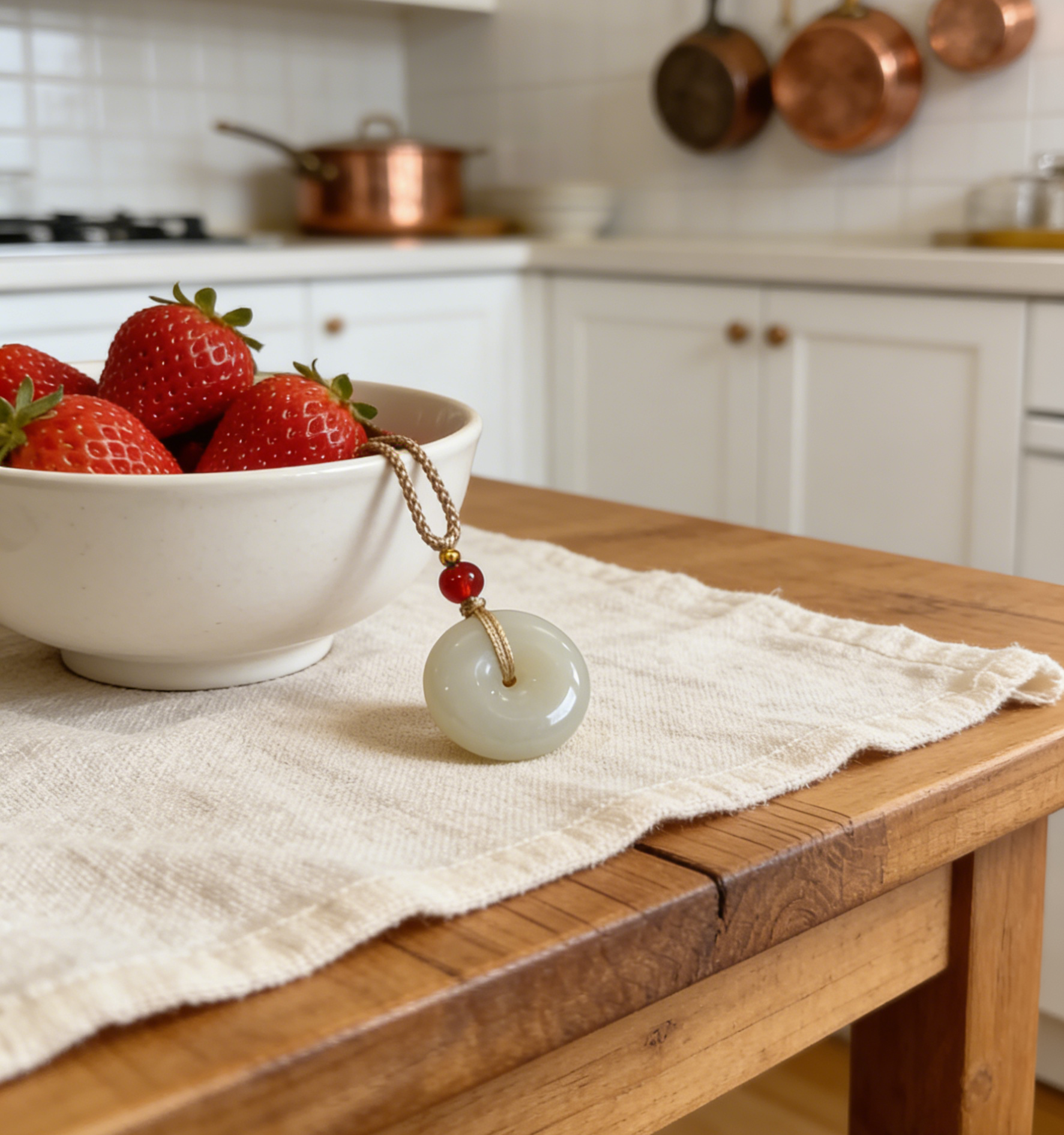The Pi An Kou is an ancient and beloved symbol. Its circular form represents heaven, perfection, and the cyclical nature of life, while the central hole signifies earth, openness, and connection. Together, they embody the harmony of "heaven and earth as one" (Tian Ren He Yi), offering a wish for complete peace, smooth-sailing fortune, and protection from harm. The pure white jade amplifies these qualities, symbolizing purity, clarity, and serene energy.